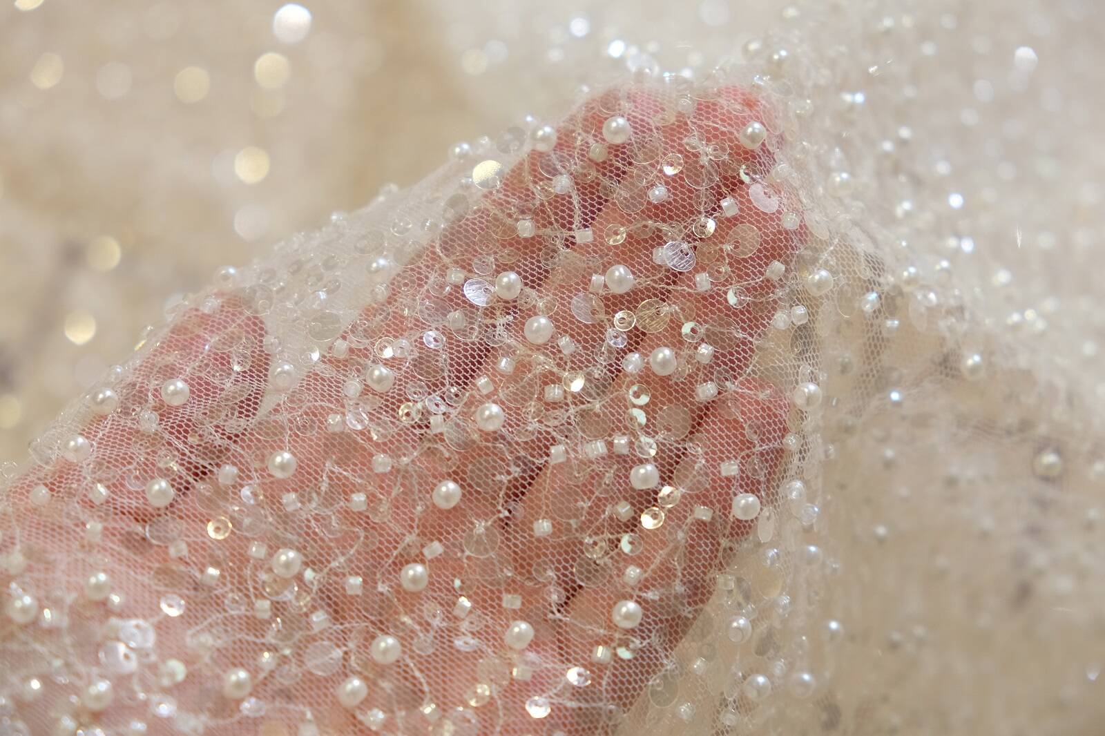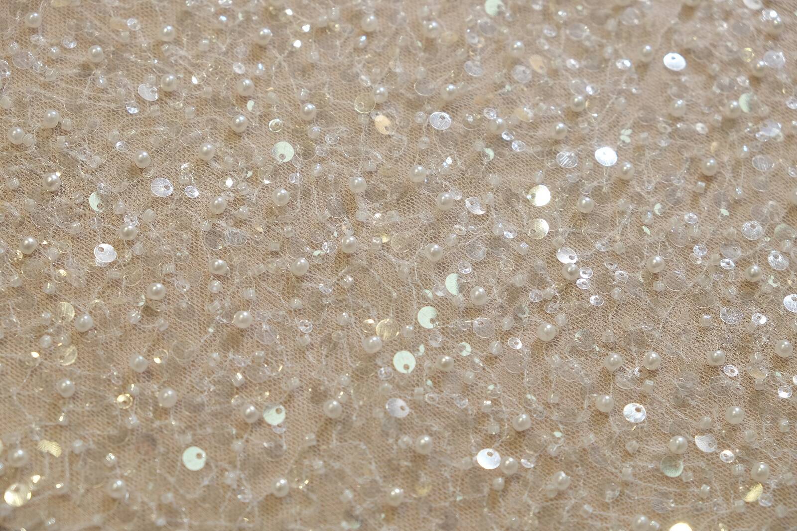 Расшитое кружевное полотно выполнено на тонкой сетчатой основе, которая делает ткань воздушной и нежной. Полотно обильно декорировано россыпью бисера, пайеток и жемчужин, которые придают мерцающий эффект. Благодаря своему роскошному виду кружево идеально подходит для пошива свадебных и вечерних платьев. Также может использоваться для отделки костюмов, аксессуаров. Полотно имеет мягкую текстуру, что позволяет комбинировать его с другими тканями. Важно учитывать, что такой материал требует бережного ухода и деликатного пошива из-за большого количества декоративных элементов. Это отличный выбор для тех, кто стремится создать роскошный образ с ноткой шика.