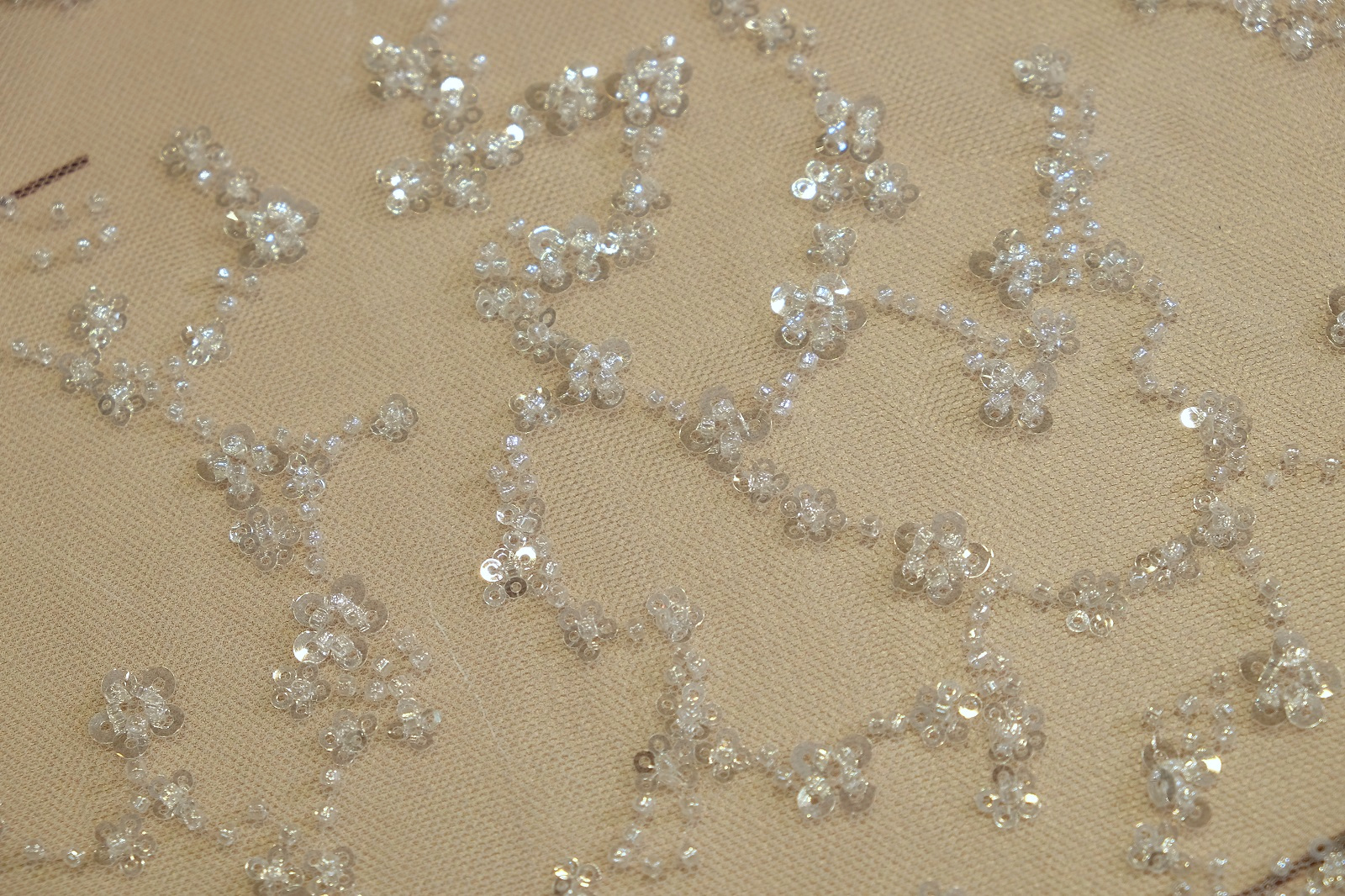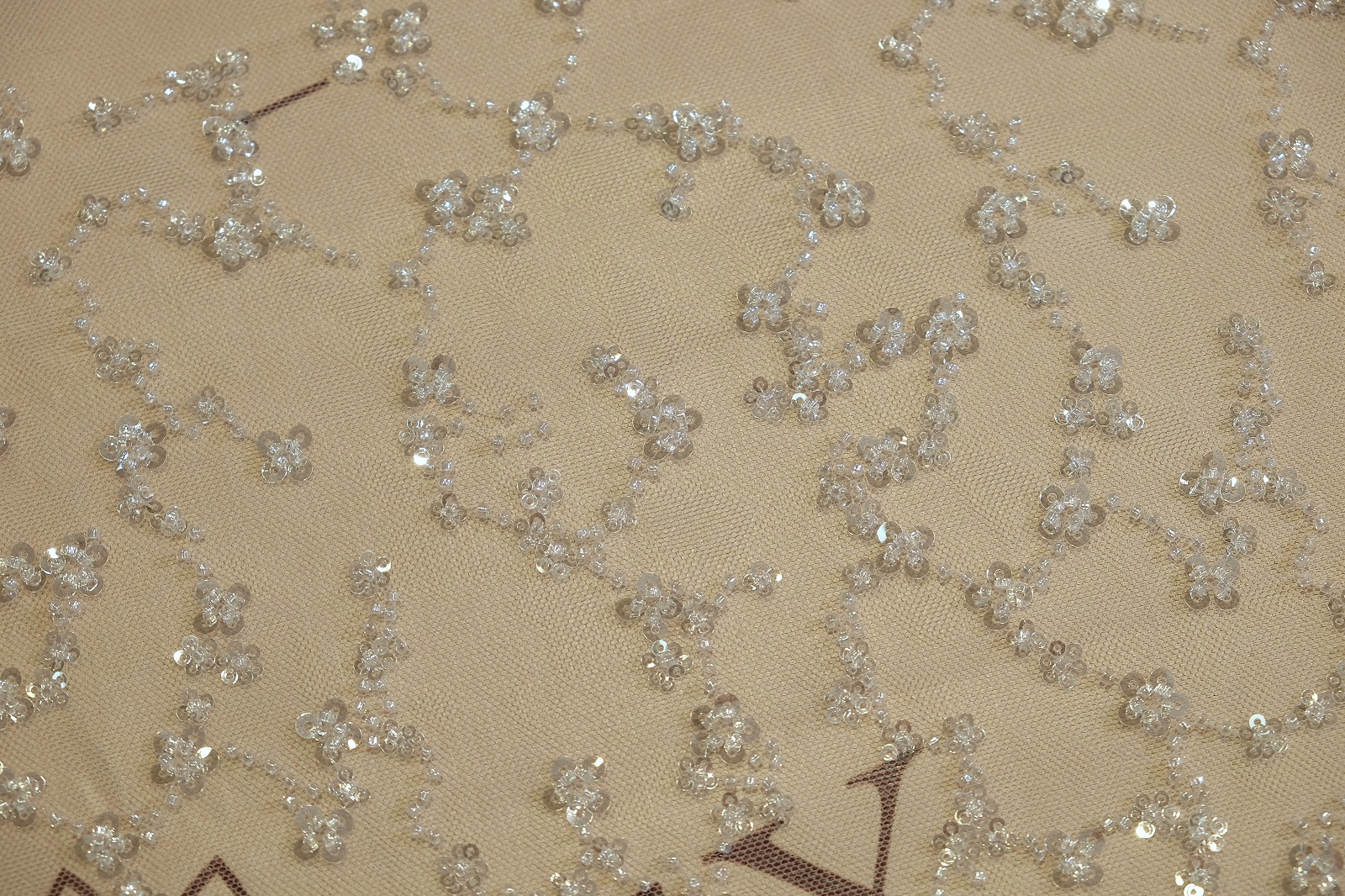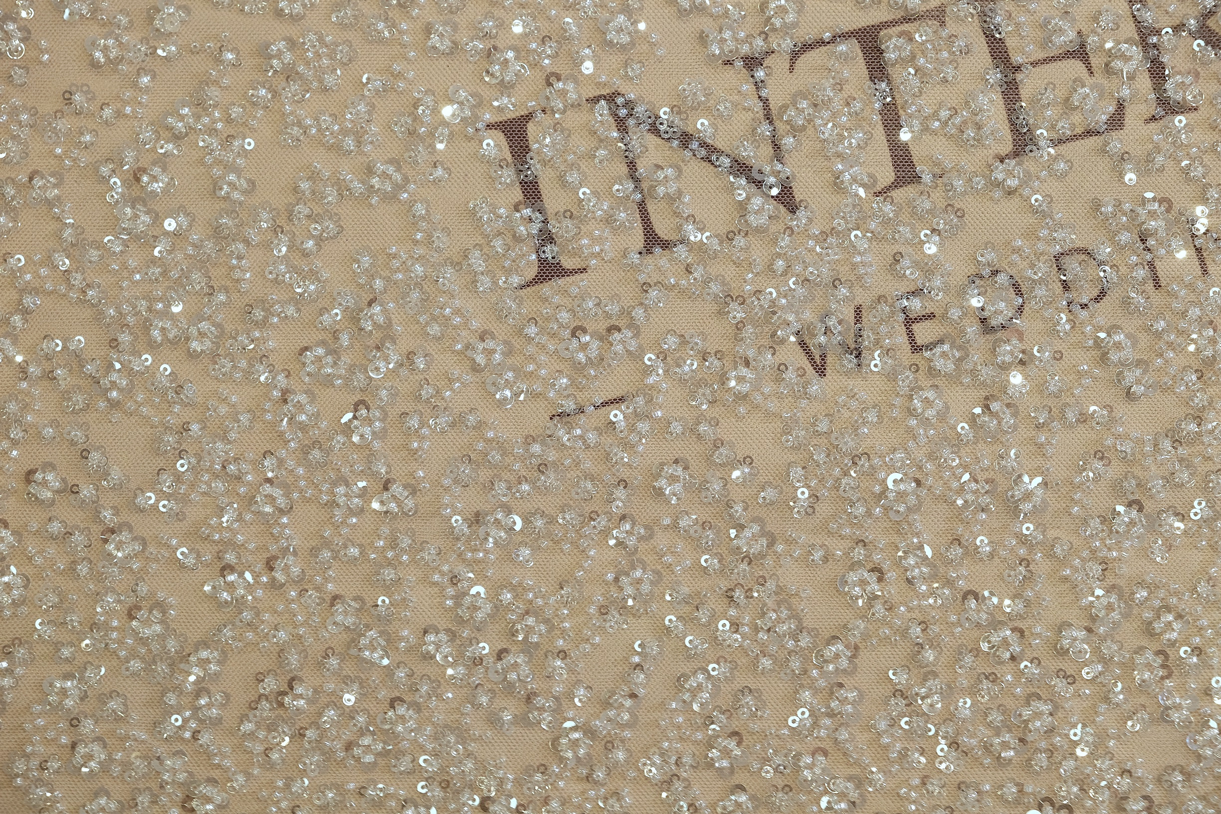 Расшитое кружевное полотно поражает изяществом и уникальным дизайном. Его основа - тонкая сетка, которая обеспечивает прозрачность и невесомость. Декор включает бисер и пайетки разного размера, создающие мягкое, благородное мерцание. Узор имеет асимметричное решение: одна часть полотна плотно покрыта флористическими элементами, а другая - постепенно разжижается, образуя эффект плавного перехода. Благодаря этому кружево отлично подходит для создания асимметричных акцентов в дизайне. Оно легко сочетается с другими тканями, добавляя наряду современного шарма. Идеальное для свадебных платьев, рукавов, корсетных вставок или шлейфов, это полотно станет центральным элементом образа.