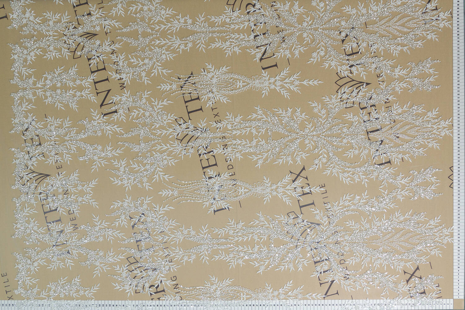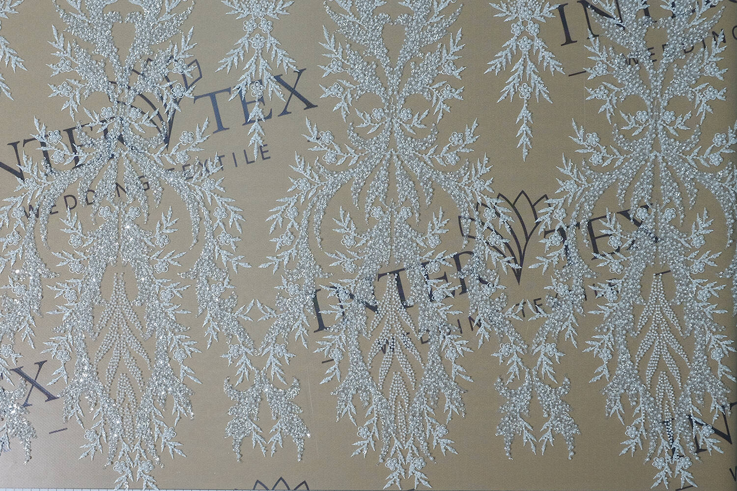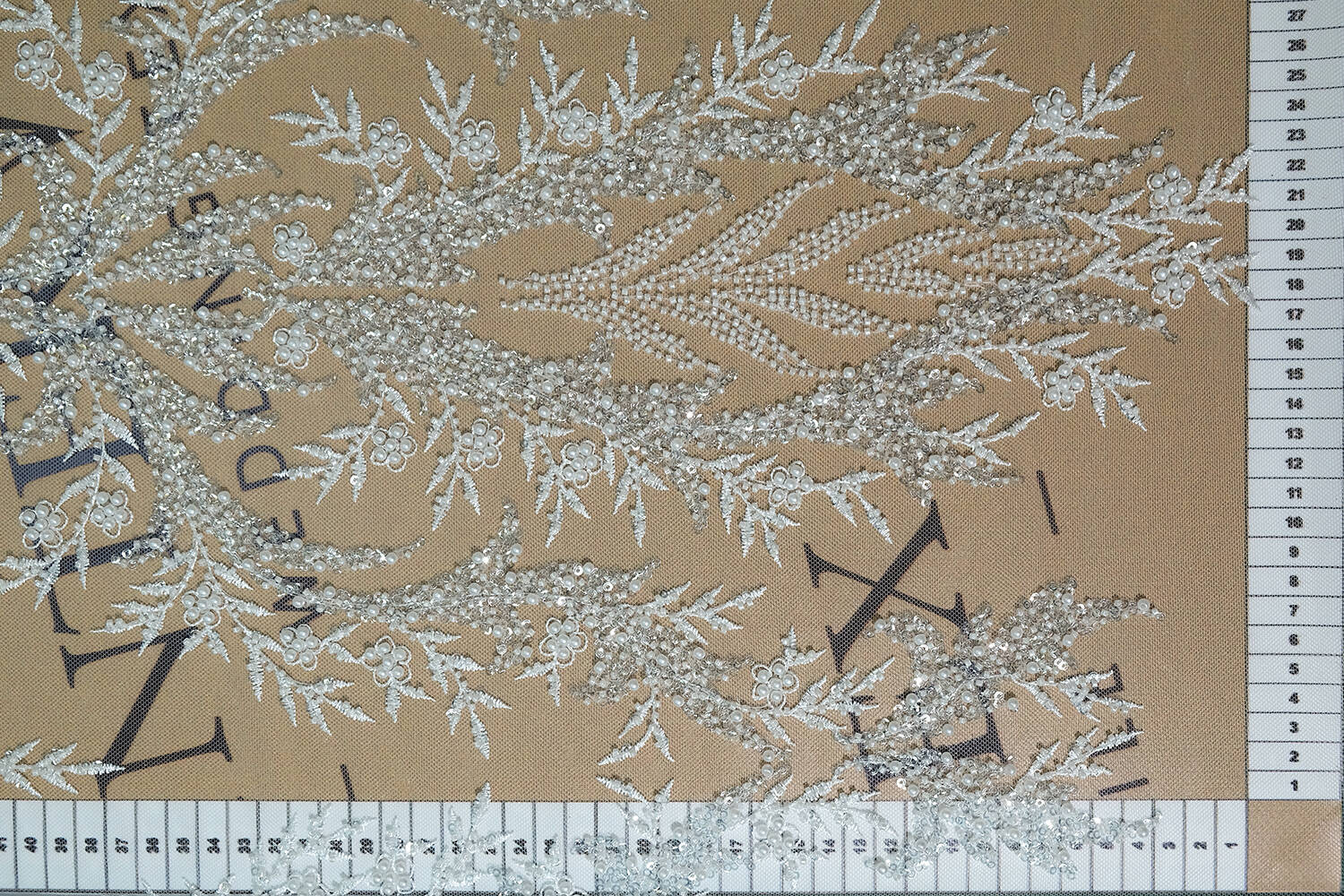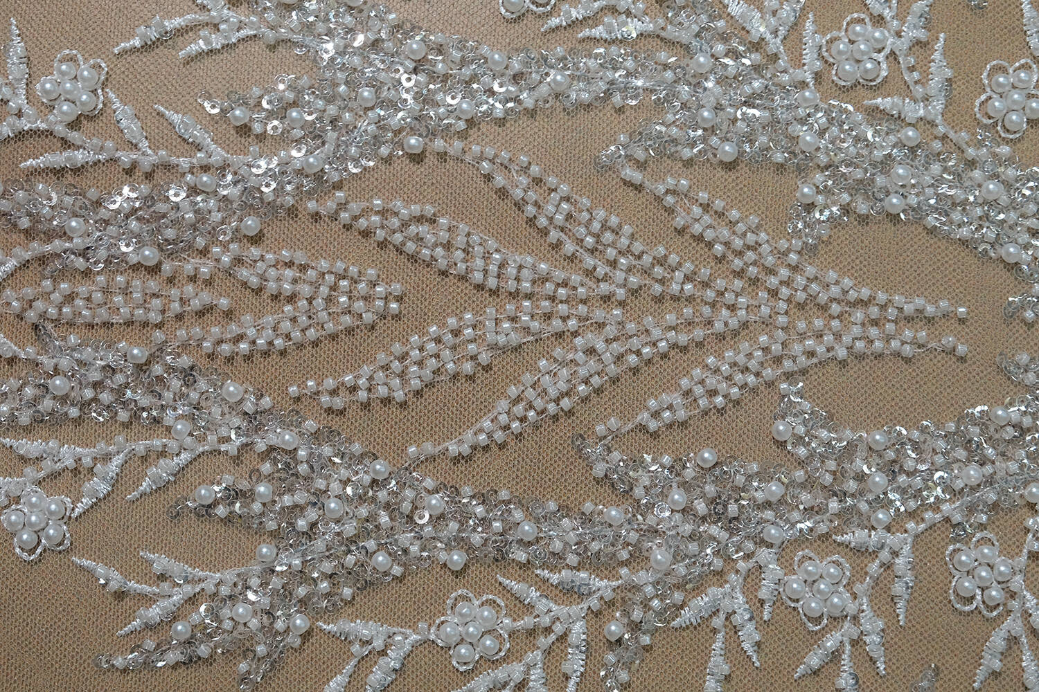 Расшитое полотно молочного цвета с флористическим рисунком поражает своей изысканностью и элегантностью. Щедро украшенное бисером и пайетками, оно сияет и переливается при каждом движении. Идеально подходит для создания свадебных платьев, вечерней одежды или эксклюзивных аксессуаров. Эта ткань придаст любому изделию роскошный и неповторимый вид.