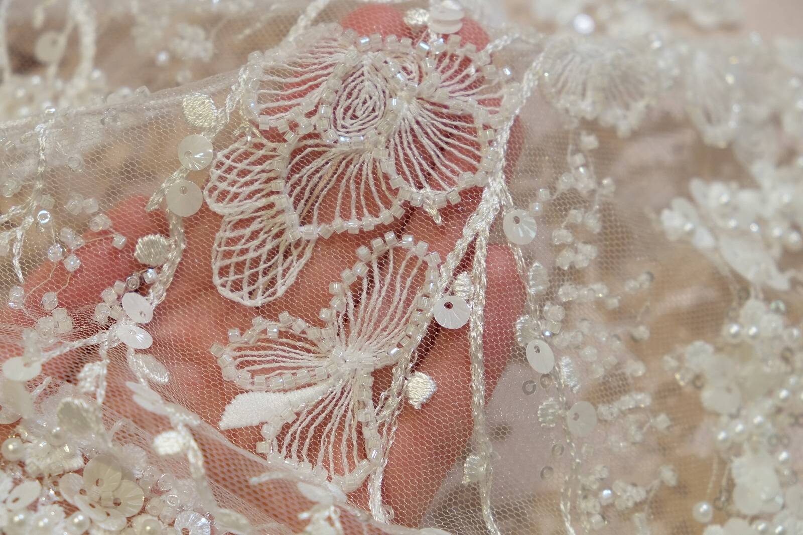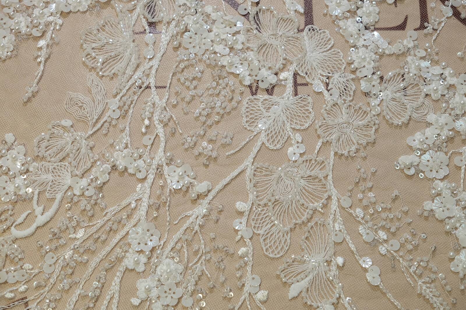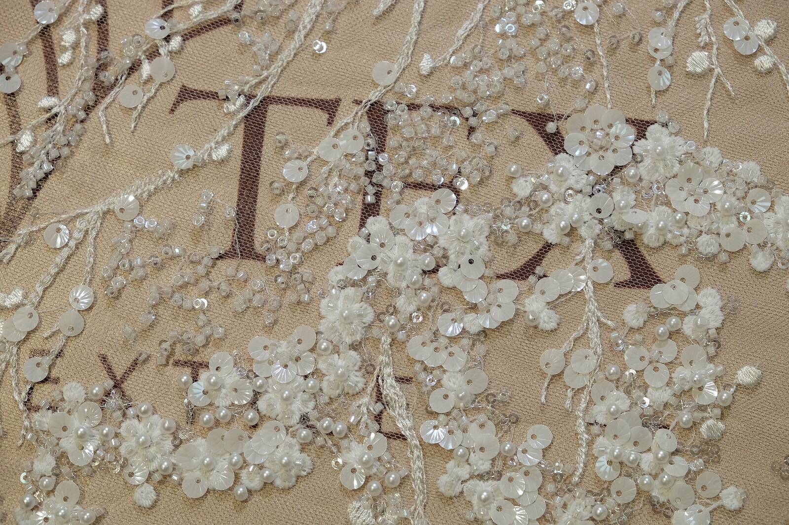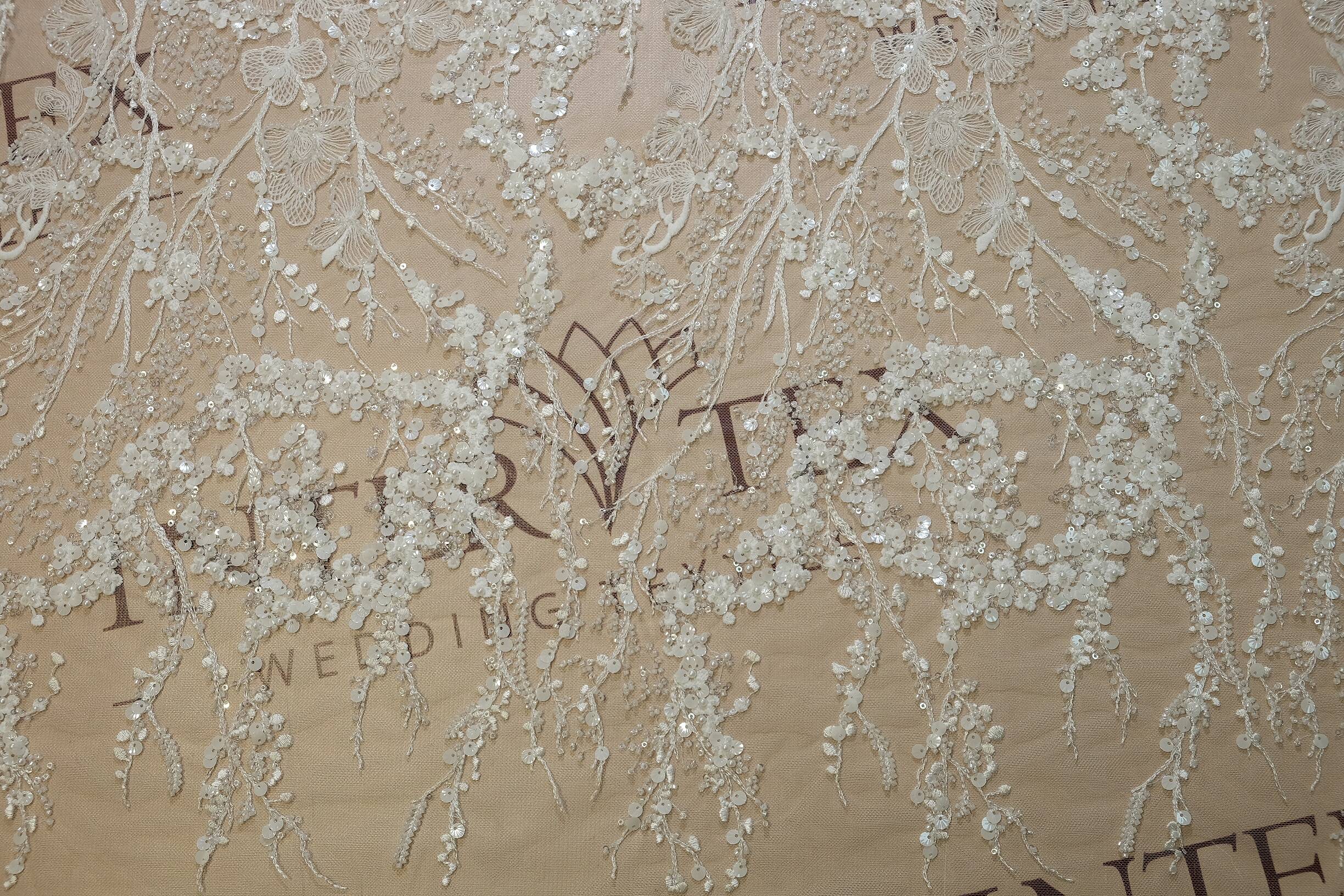 Кружевное полотно на прозрачной основе сочетает легкость и глубину. Узор состоит из цветочных мотивов, переплетенных с тонкими веточками, что придает композиции природной гармонии. Декор выполнен с помощью вышивки, дополнен нежными пайетками разных форм и размеров, бисером. Благодаря сложной текстуре кружево выглядит роскошно и привлекает внимание. Оно идеально подходит для создания свадебных и вечерних платьев, корсетов и декоративных вставок в блузах. Ткань легко драпируется, что позволяет экспериментировать с фасонами. Молочный оттенок добавляет универсальности. Декоративные элементы мягко переливаются при движении, создавая эффект мерцания.
