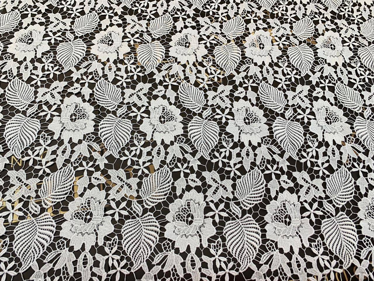 Кружево макраме с цветочным рисунком, который не имеет направления - выкладывается во все стороны. Выразительные контуры цветов придают полотну изысканности, а листья с тонкими полосатыми деталями создают гармоничный вид. Кружево не имеет прозрачной основы, что делает его отличным выбором для акцентных элементов в одежде и интерьере. Материал хорошо драпируется. Его используют для пошива платьев, блуз, топов, свадебных нарядов, а также для отделки занавесок, скатертей и т.д. Изысканность и детальность узора делают его идеальным выбором для элегантных и стильных изделий.