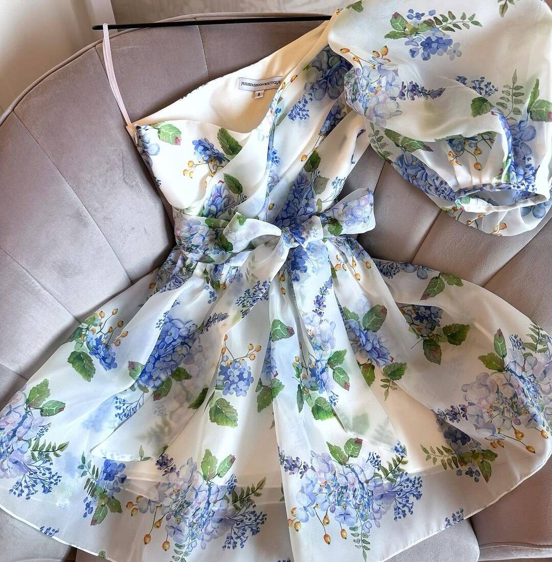Фото платья: instagram.com/fur_season; органза с принтом голубая гортензия из каталога магазина InterTex