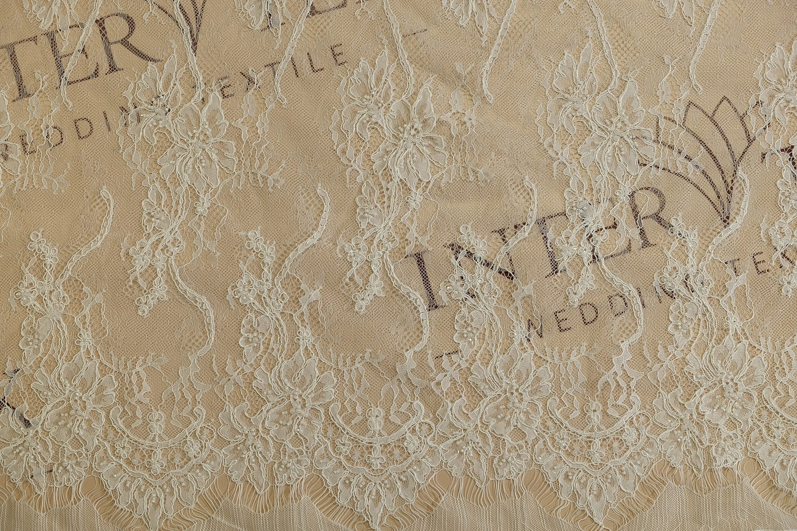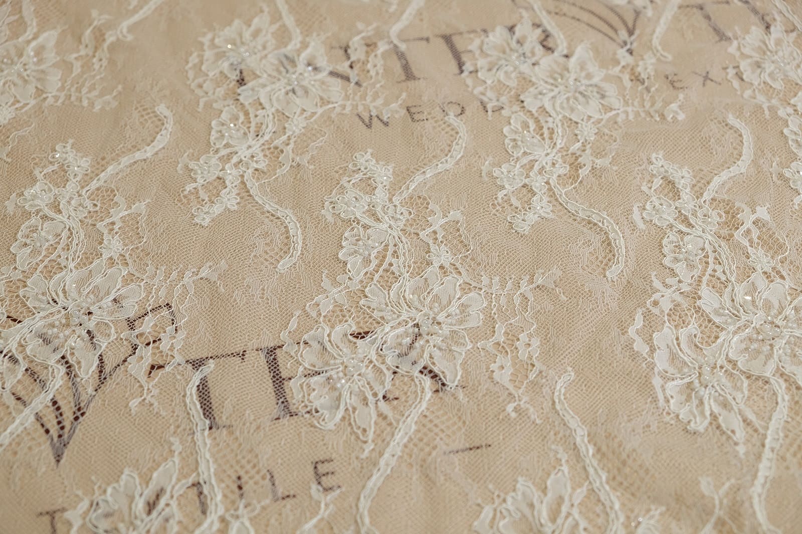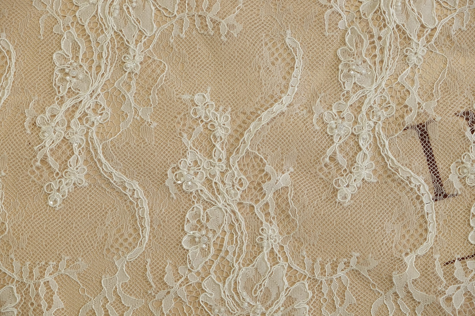 Шантильи с бисером и кордом выделяется изысканным цветочным орнаментом, где большие распустившиеся цветы разных форм плавно переходят в грациозные лозы и мелкие бутоны на тонкой сетке. Оно расшито бисером и пайетками, которые акцентируют центры цветов, добавляя нежное мерцание. Кружево выглядит роскошно и романтично, придавая элегантность без утяжеления силуэта.