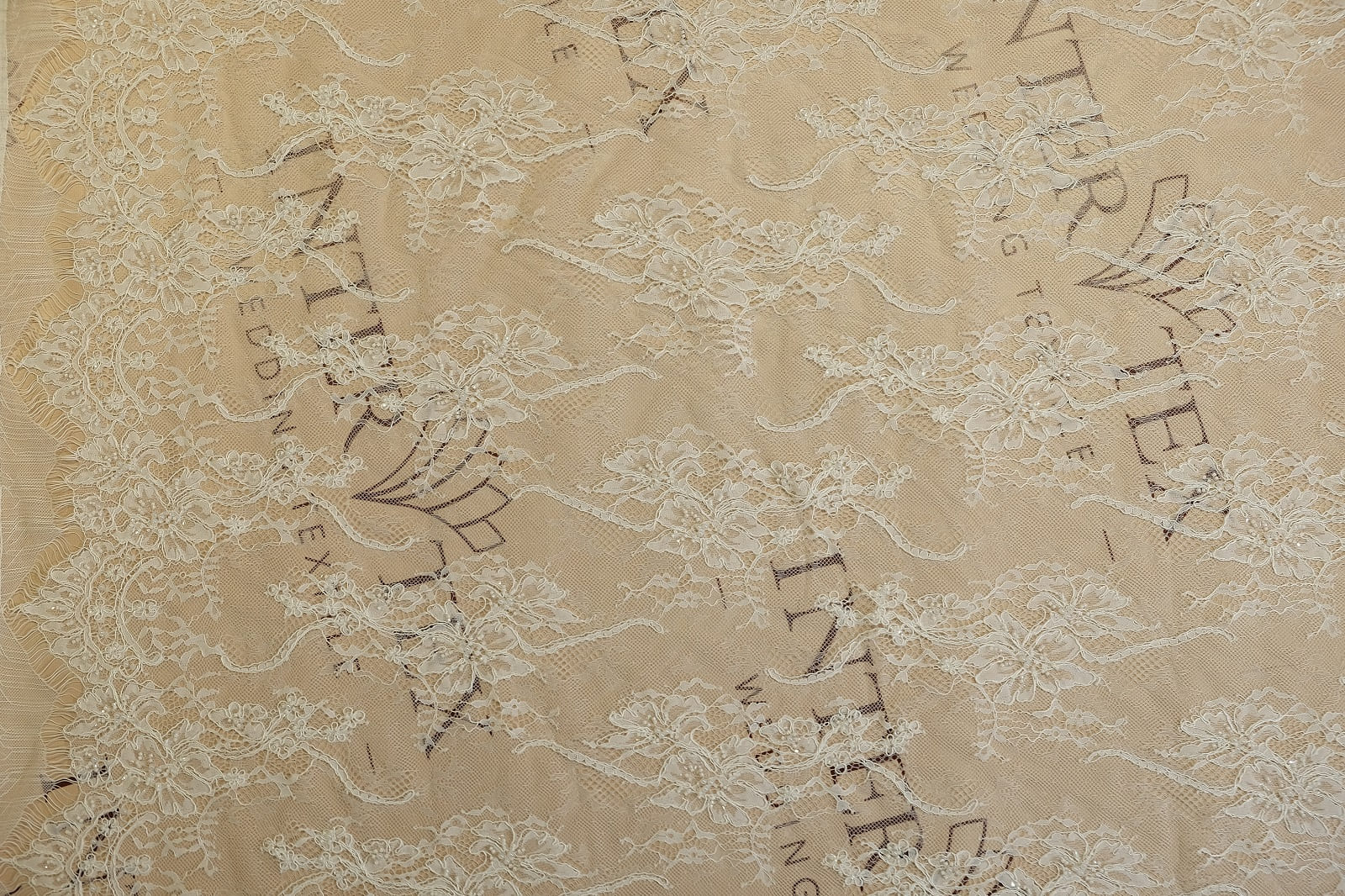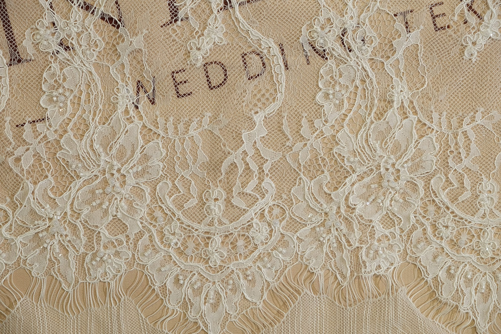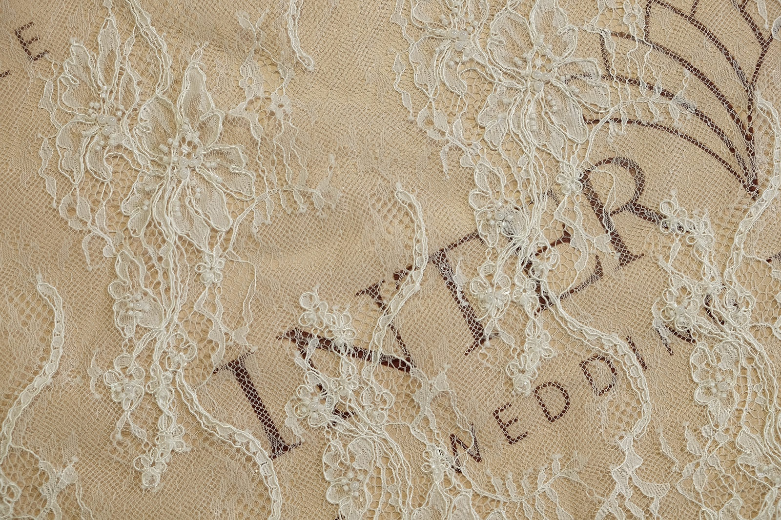 Шантильи с бисером и кордом выделяется изысканным цветочным орнаментом, где большие распустившиеся цветы разных форм плавно переходят в грациозные лозы и мелкие бутоны на тонкой сетке. Оно расшито бисером и пайетками, которые акцентируют центры цветов, добавляя нежное мерцание. Кружево выглядит роскошно и романтично, придавая элегантность без утяжеления силуэта.