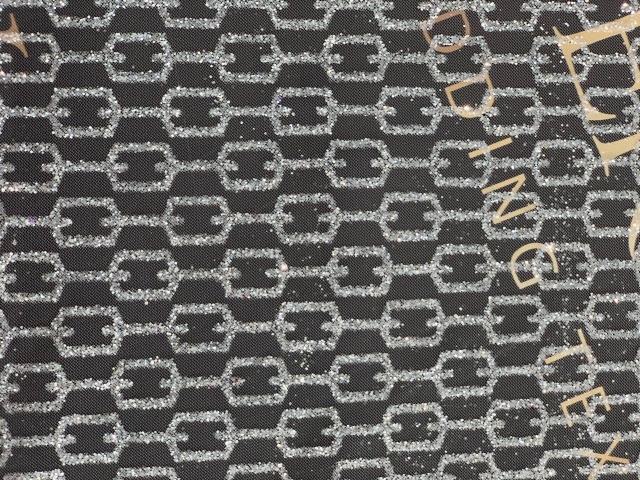 Качественная евросетка украшена узором "цепь" серебристого цвета, который сверкает высококачественным глиттером. Этот узор прекрасно выглядит на солнце и при искусственном освещении. Кроме того, ткань легко драпируется и не мнется, что делает ее идеальной для создания складок. Она прекрасно подходит для пышных юбок, как длинных, так и коротких. Даже маленький элемент из этой сетки может украсить любой наряд!