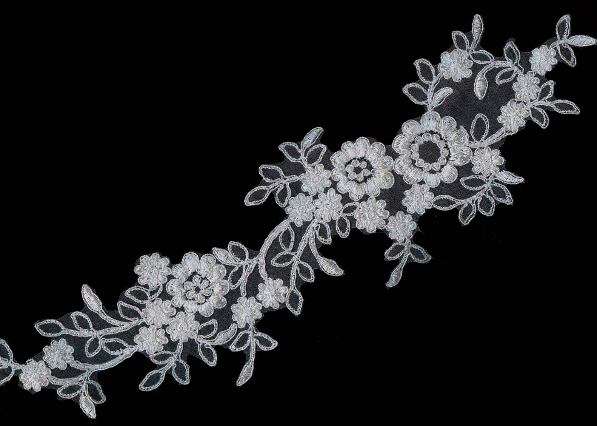 Аплікація з кордом має візерунок із великих квітів, дрібних бутонів і листя, які плавно переплітаються. Центральні квіти виділяються за рахунок детальних пелюсток, оточених витонченими гілочками та листочками, що надає їй елегантності та текстури. Корд, використаний для обведення елементів, створює об'ємний ефект, підкреслюючи контури квітів і листя. Ця аплікація ідеально підійде для прикраси весільних суконь, аксесуарів або декоративного текстилю.
