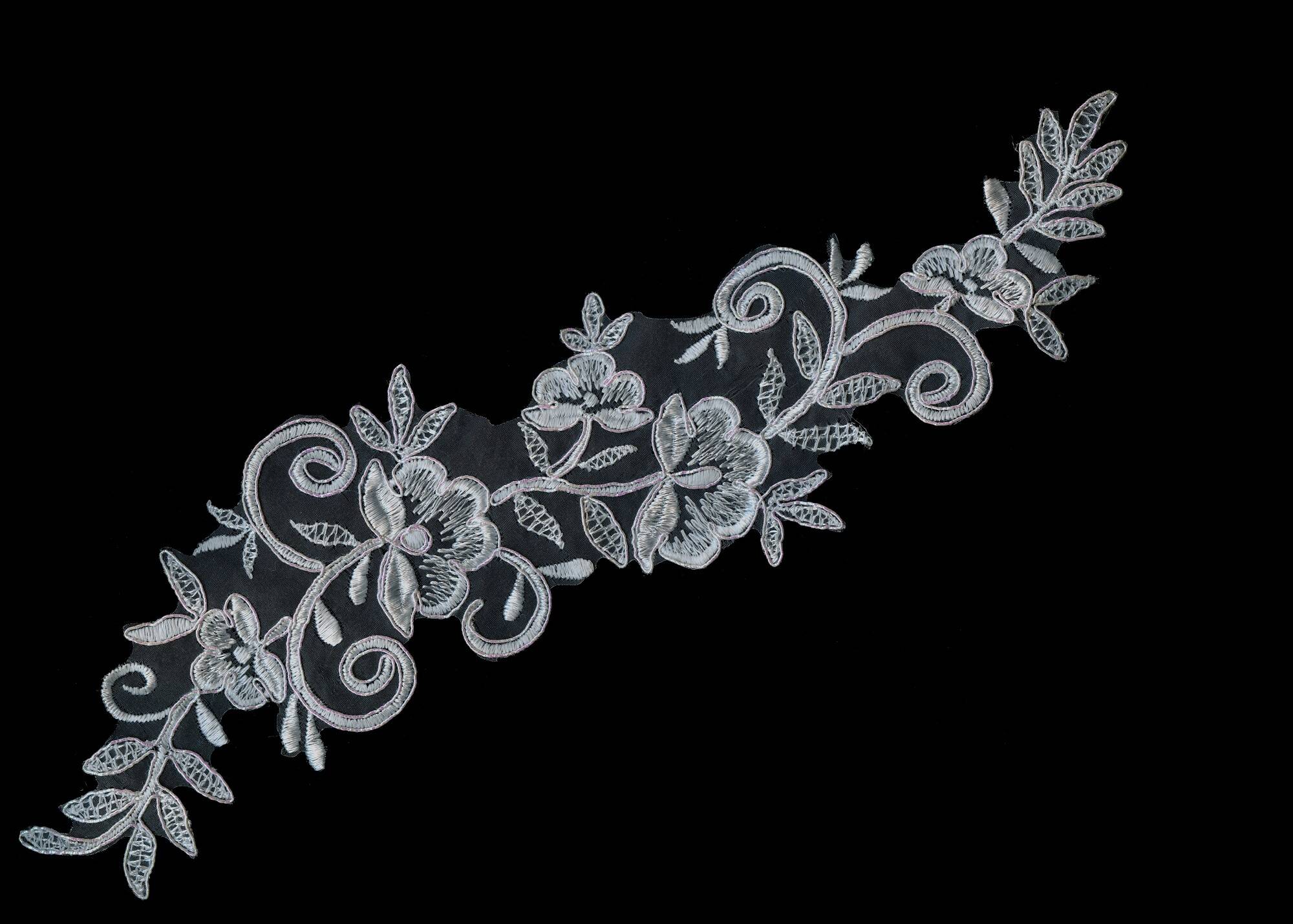 Аплікація з кордом у білому кольорі з перламутром, де квіти розташовані в ряд, вражає своєю узгодженістю та вишуканістю. Ця деталь створює стильний та елегантний фокус, який відмінно доповнить образ. Приблизний розмір - 10х36см.