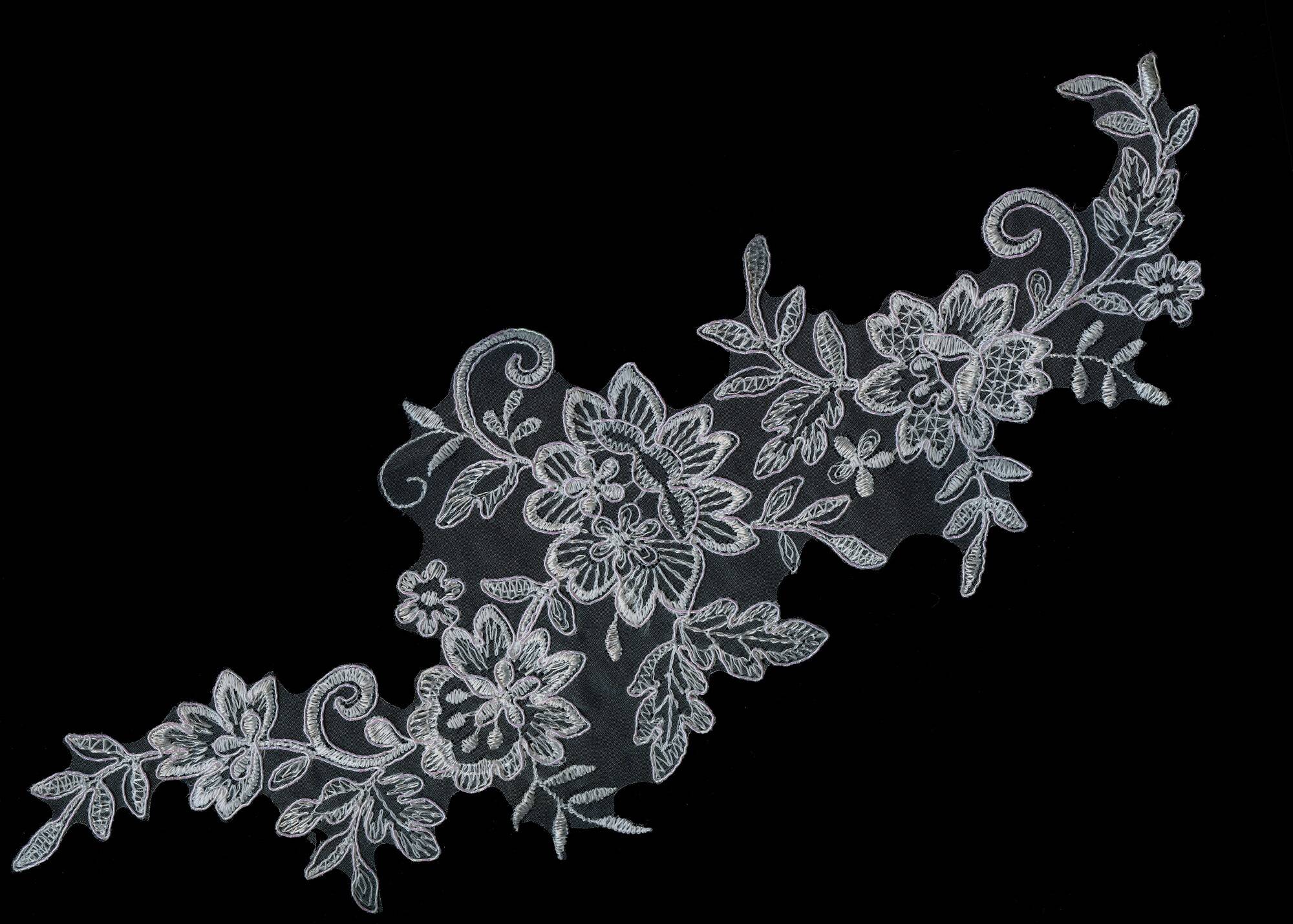Аплікація з кордом у білому кольорі з перламутровим відливом вражає своєю елегантністю та цікавим оформленням квітів. Ця деталь додасть вашому вбранню унікальності та стилю, створюючи неперевершений образ. Приблизний розмір - 30х13см.