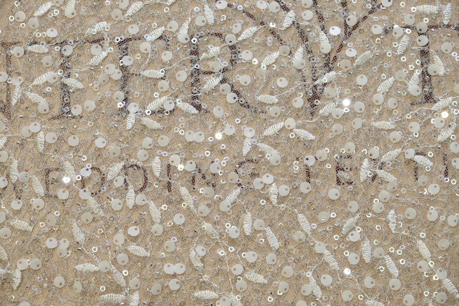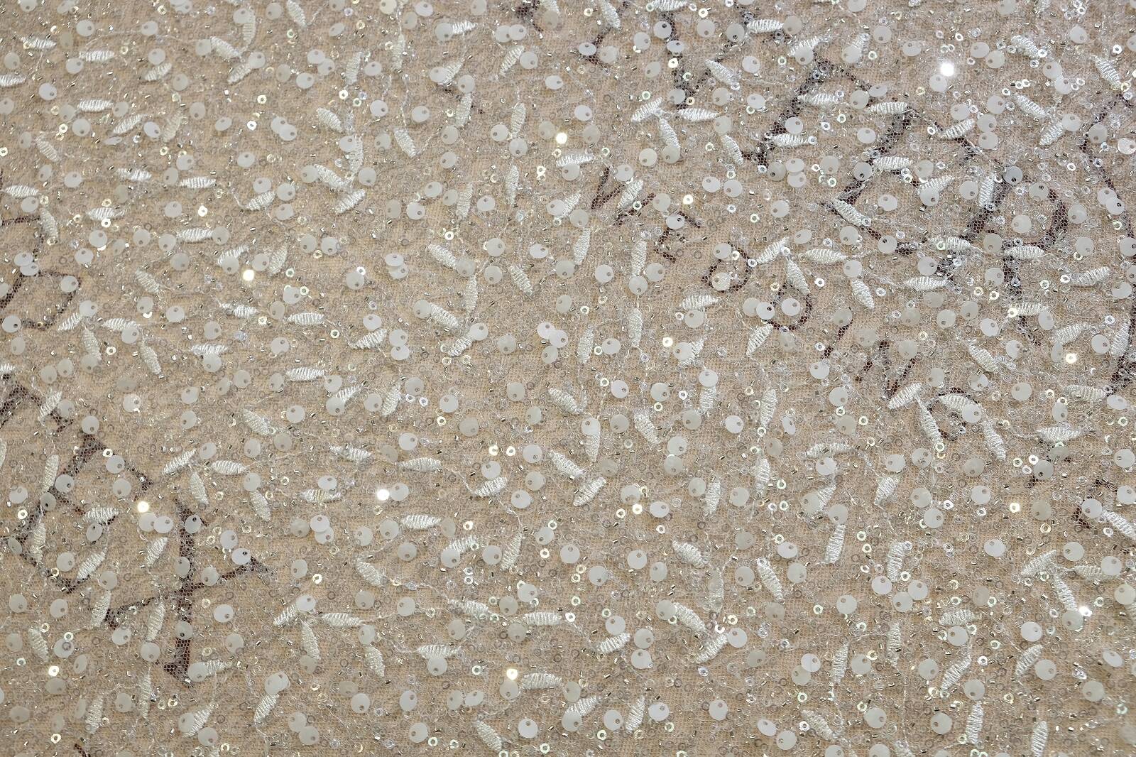 Мереживне полотно виконане на прозорій сітчастій основі, заповненій безліччю маленьких і великих паєток та бісеру, що створюють ефект блиску і руху. По всьому полотну ниткою вишито маленькі елементи, схожі на листочки. Мереживо виглядає легким і ефемерним. Такий матеріал ідеально підійде для пошиття та оздоблення весільних суконь, вечірніх нарядів або елементів декору. Його перевагою є універсальність і здатність гармонійно комбінуватися з іншими тканинами, додаючи їм розкішного вигляду. Незважаючи на щільне декорування, полотно зберігає вишуканість і дозволяє створювати ефектні акценти, що завжди привертають увагу.