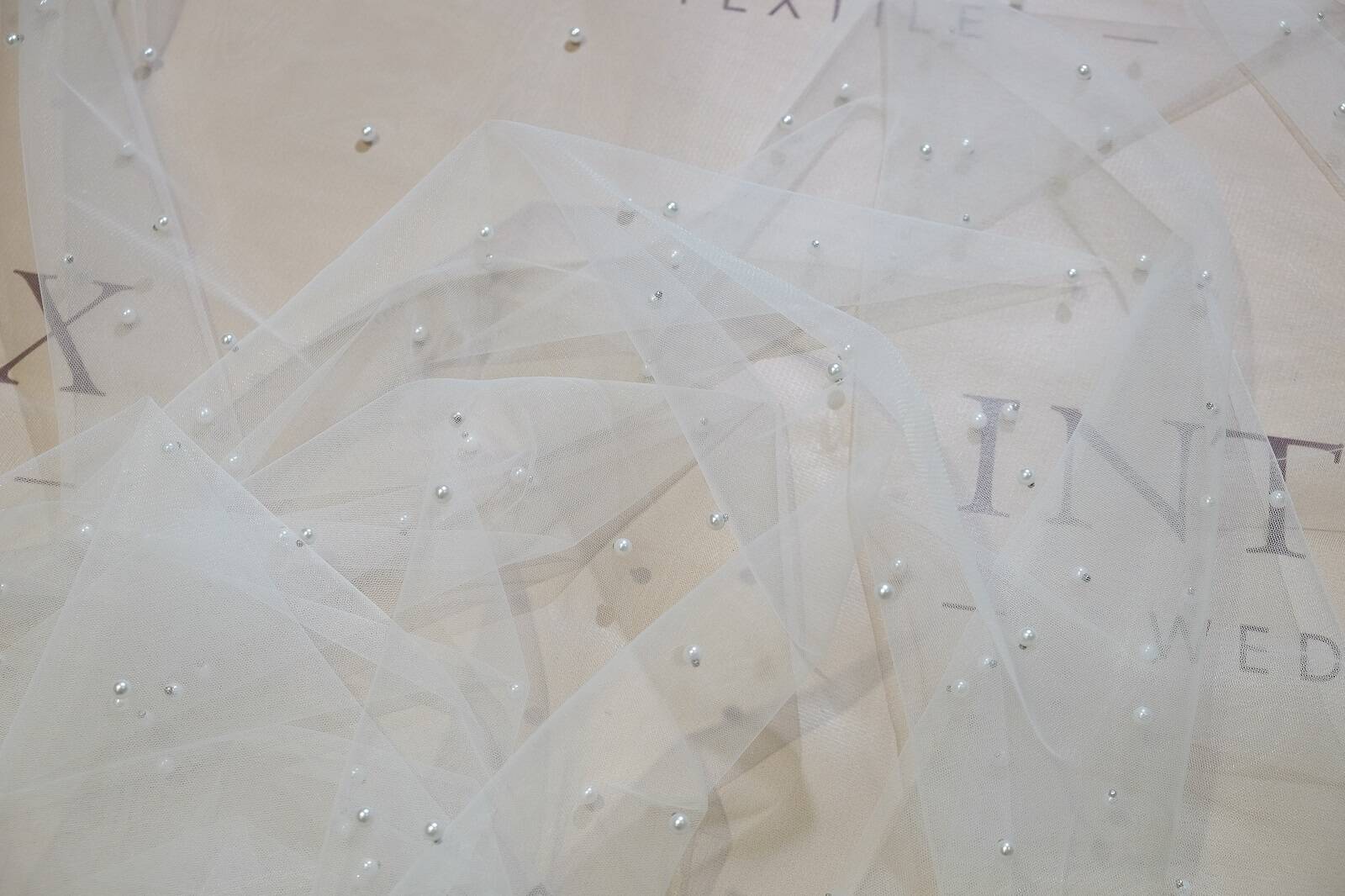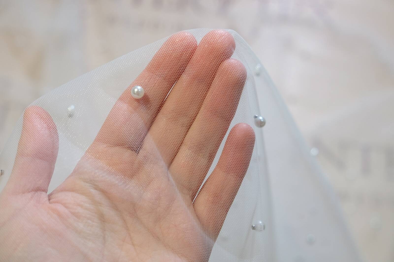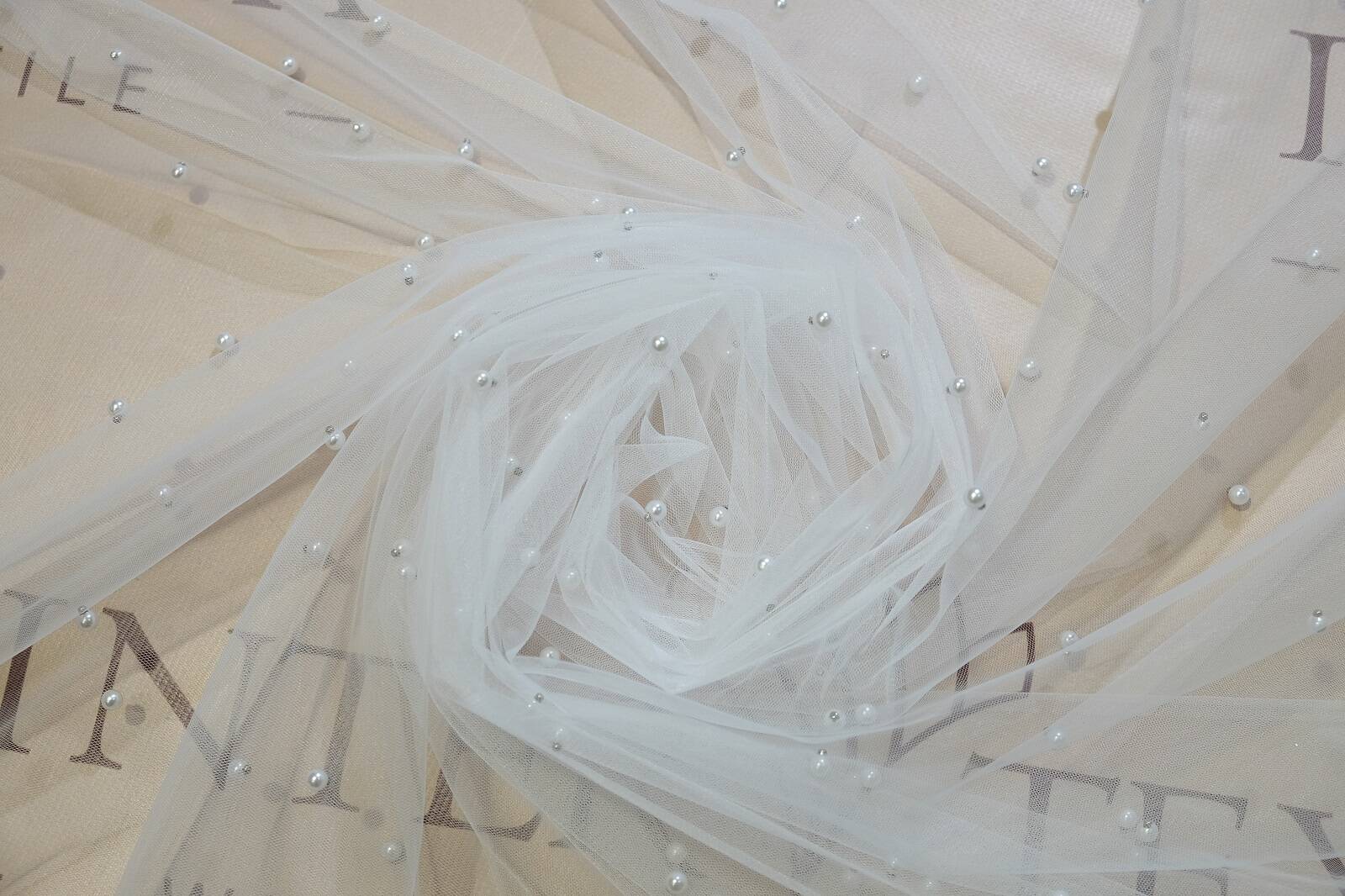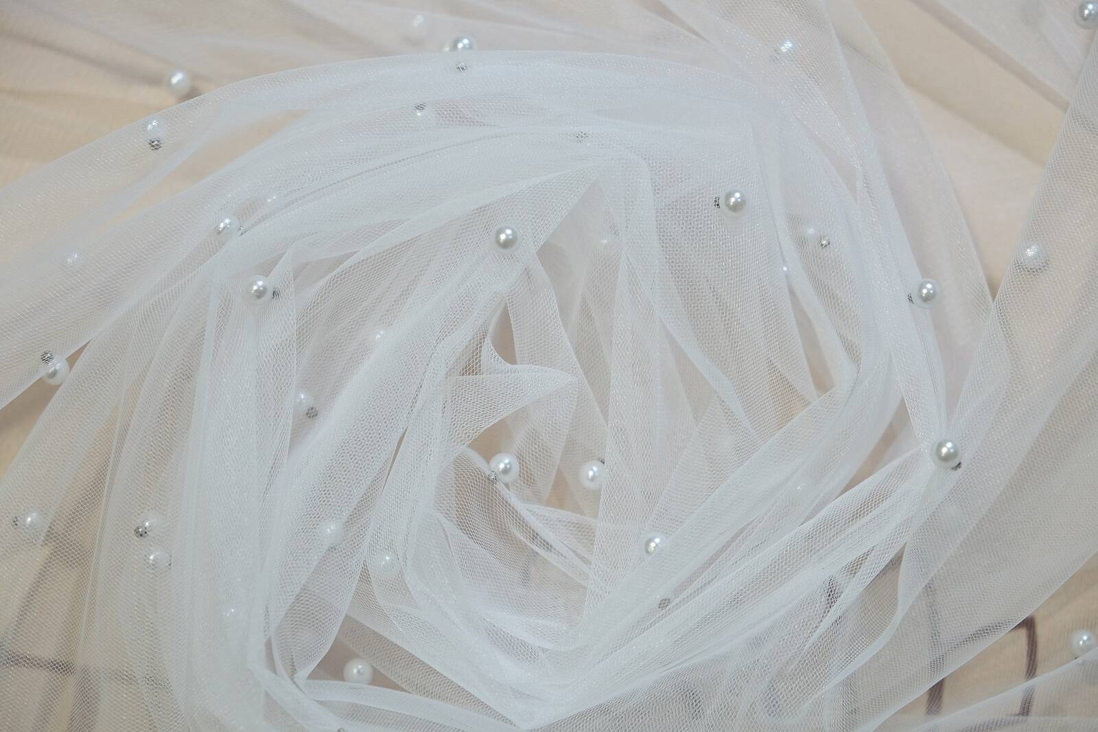 Сітка з перлинками — це ніжне, напівпрозоре полотно, що створює ефект легкості та невагомості. Матеріал трохи тягнеться, добре драпірується. З лицьового боку хаотично розташовані перлини, які міцно закріплені, додаючи полотну вишуканості та легкого мерехтіння. Сітка не мнеться та не потребує особливого догляду, що робить її практичною у використанні. Ідеально підходить для створення весільного та вечірнього вбрання, фат, накидок, а також для декору інтер’єрів та святкових оформлень.